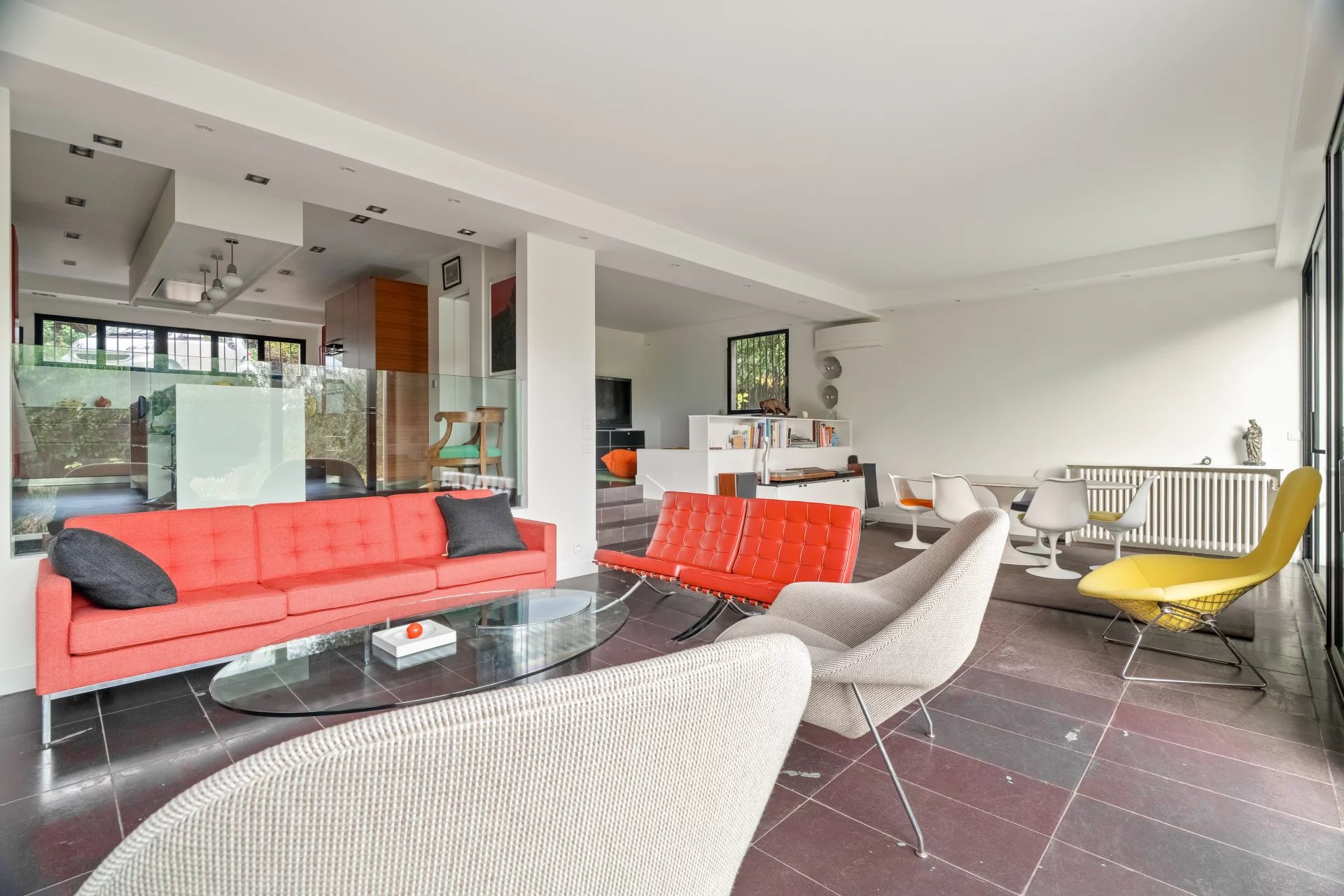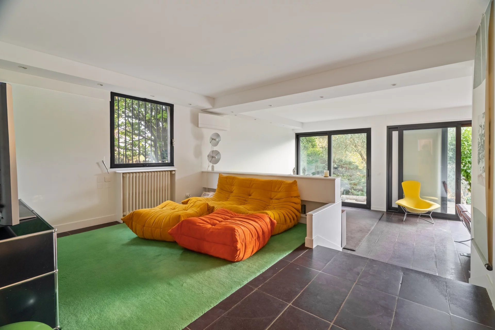 Située dans le très recherché Plateau Thery, à proximité immédiate du Centre Ancien, des écoles, des commerces et à seulement 600 m de la gare (Ligne L – La Défense / Saint-Lazare), cette élégante maison familiale d’architecte édifiée en 1964 bénéficie d’un calme absolu, d’une absence totale de vis-à-vis et d’un environnement particulièrement privilégié.